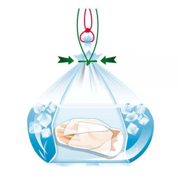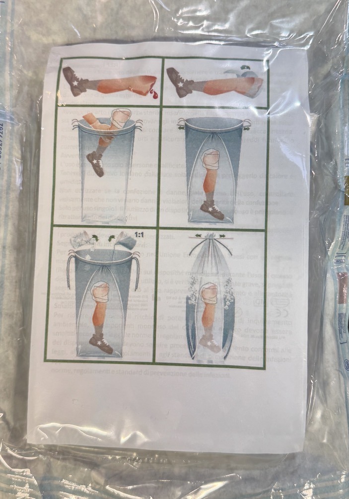 Posene er sterile, ytterpose og innerpose er sveiset sammen. Amputat legges i innerposen, kunstig is+vann i ytterposen, så rask transport til sykehus.