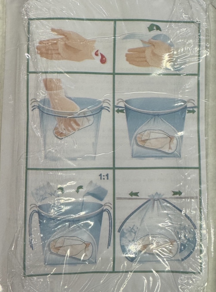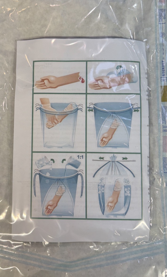Posene er sterile, ytterpose og innerpose er sveiset sammen. Amputat legges i innerposen, kunstig is+vann i ytterposen, så rask transport til sykehus.