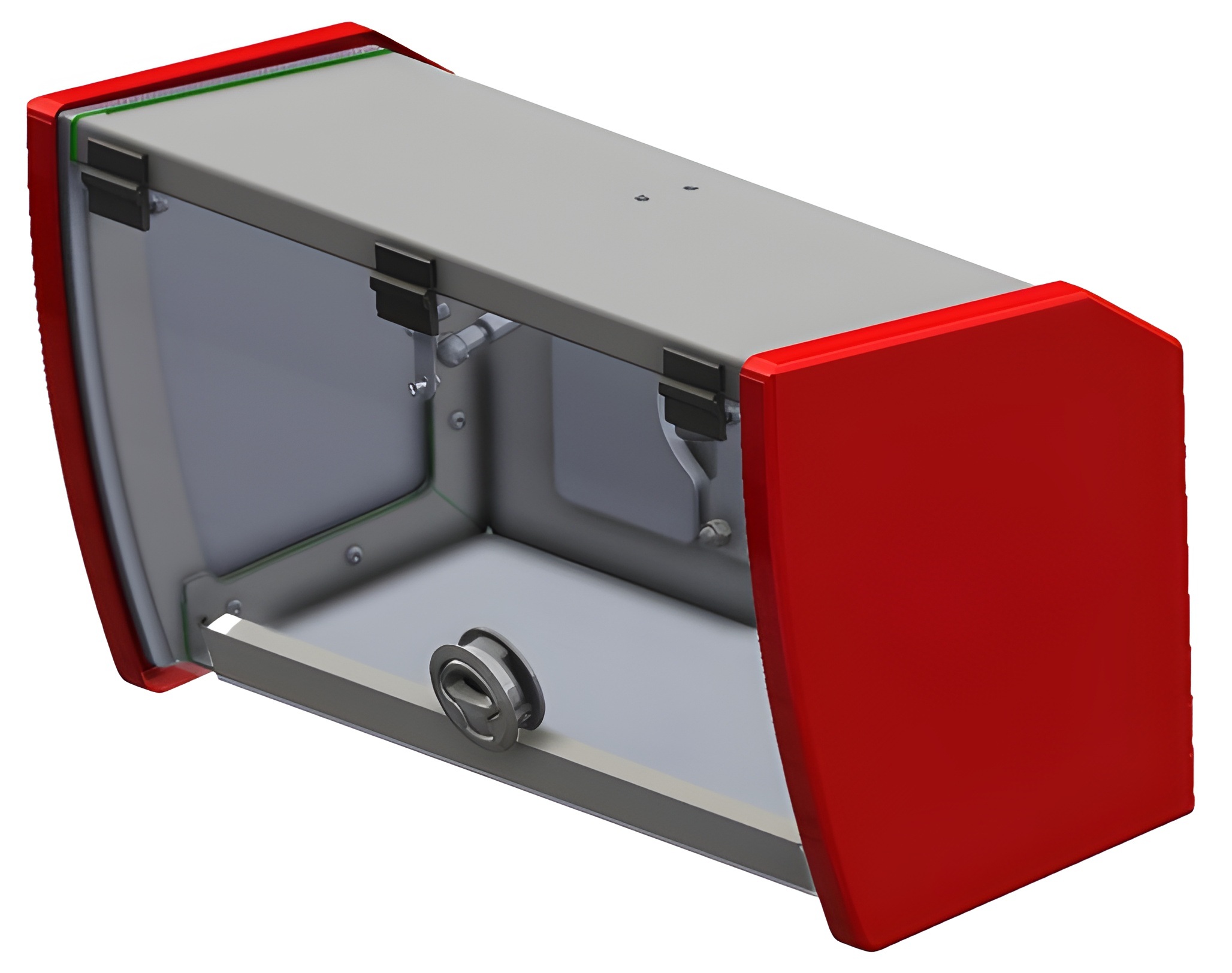 Its contoured design allows installation in both flat and curved interior surfaces, making it suitable for a wide range of vehicle layouts. The clear, flip-up hinged door ensures full visibility and easy access to stored equipment from both seated and standing positions, improving workflow during critical operations.