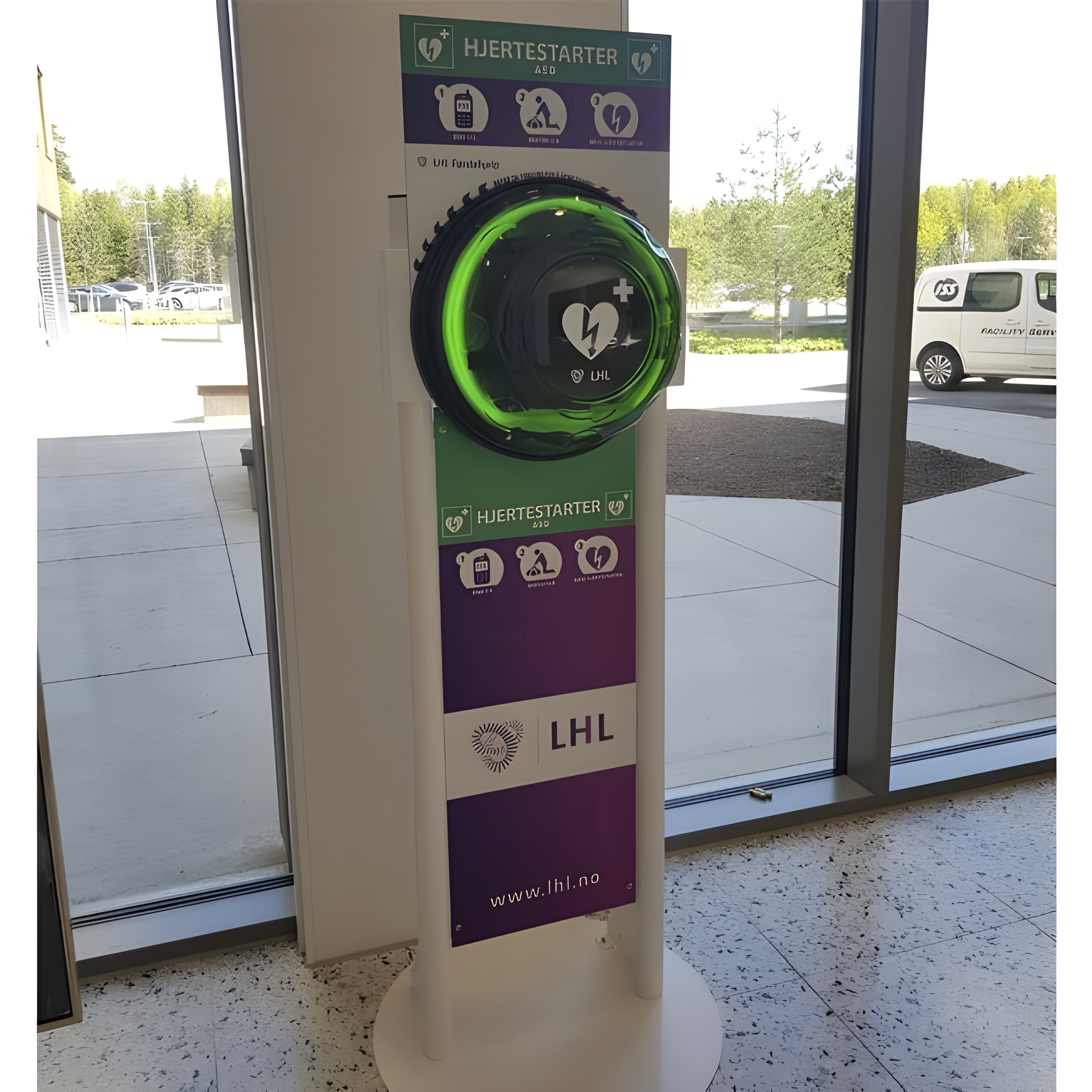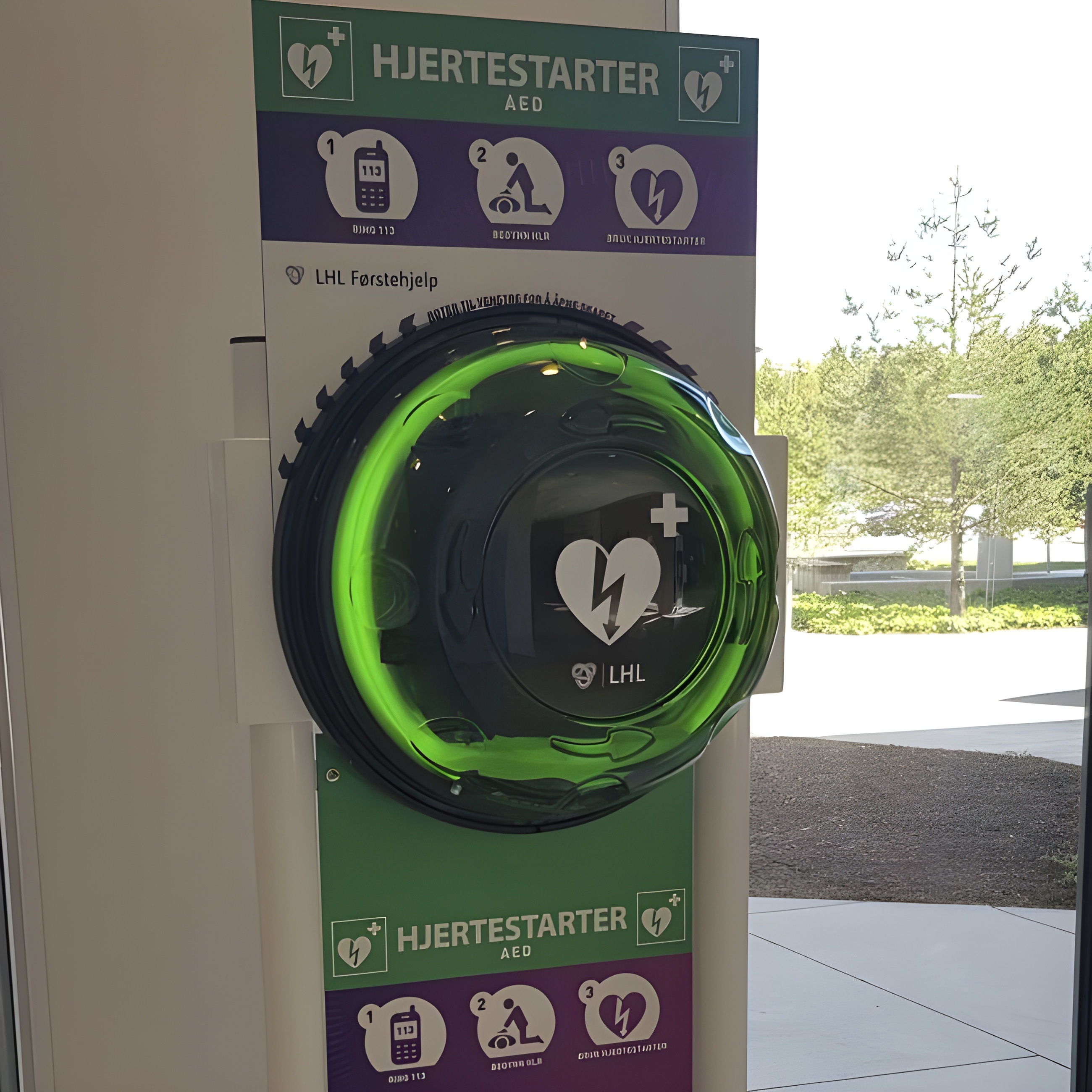 Skapet er designet for utendørs bruk, med innebygde varmeelementer, solid konstruksjon og et effektivt alarmsystem som beskytter hjertestarteren i all slags vær. I tillegg sørger en tydelig design med belysning og GSM-tilkobling for at skapet er enkelt å finne – både fysisk og digitalt.