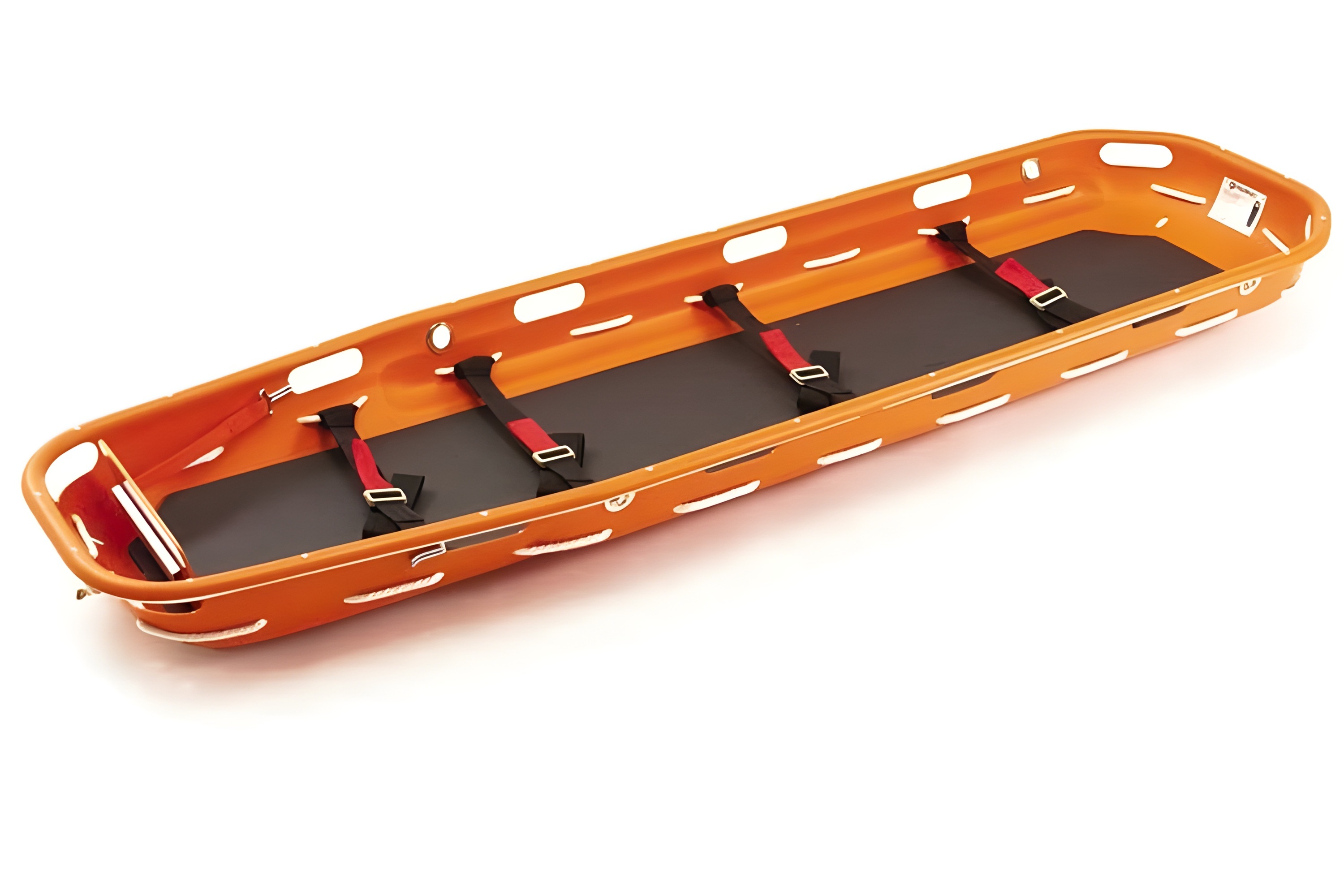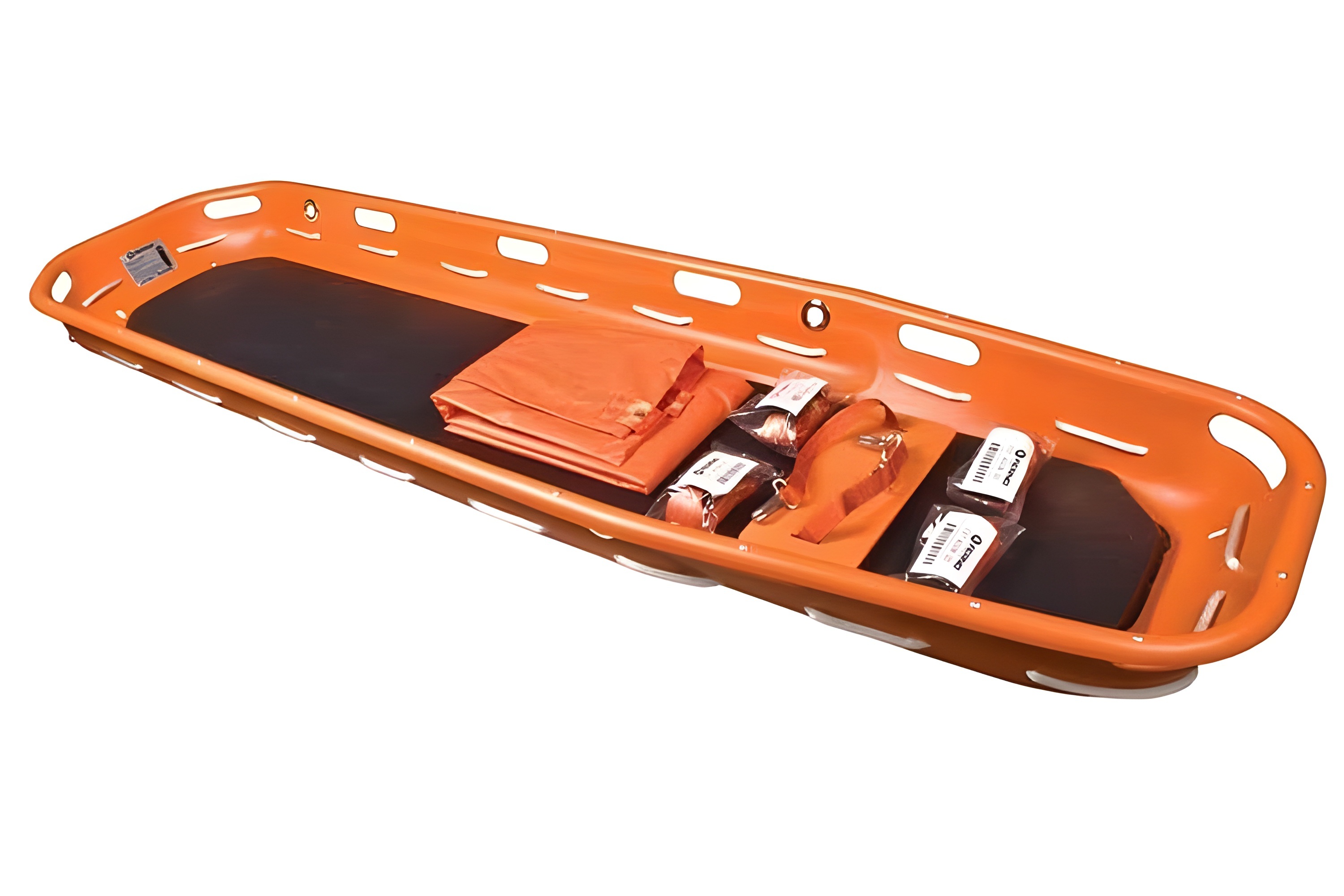- Formstøpt redningsbåre i polyetylen med en kraftig ramme av aluminium, noe som gjør båren tett, slik at den ikke ruster eller korroderer