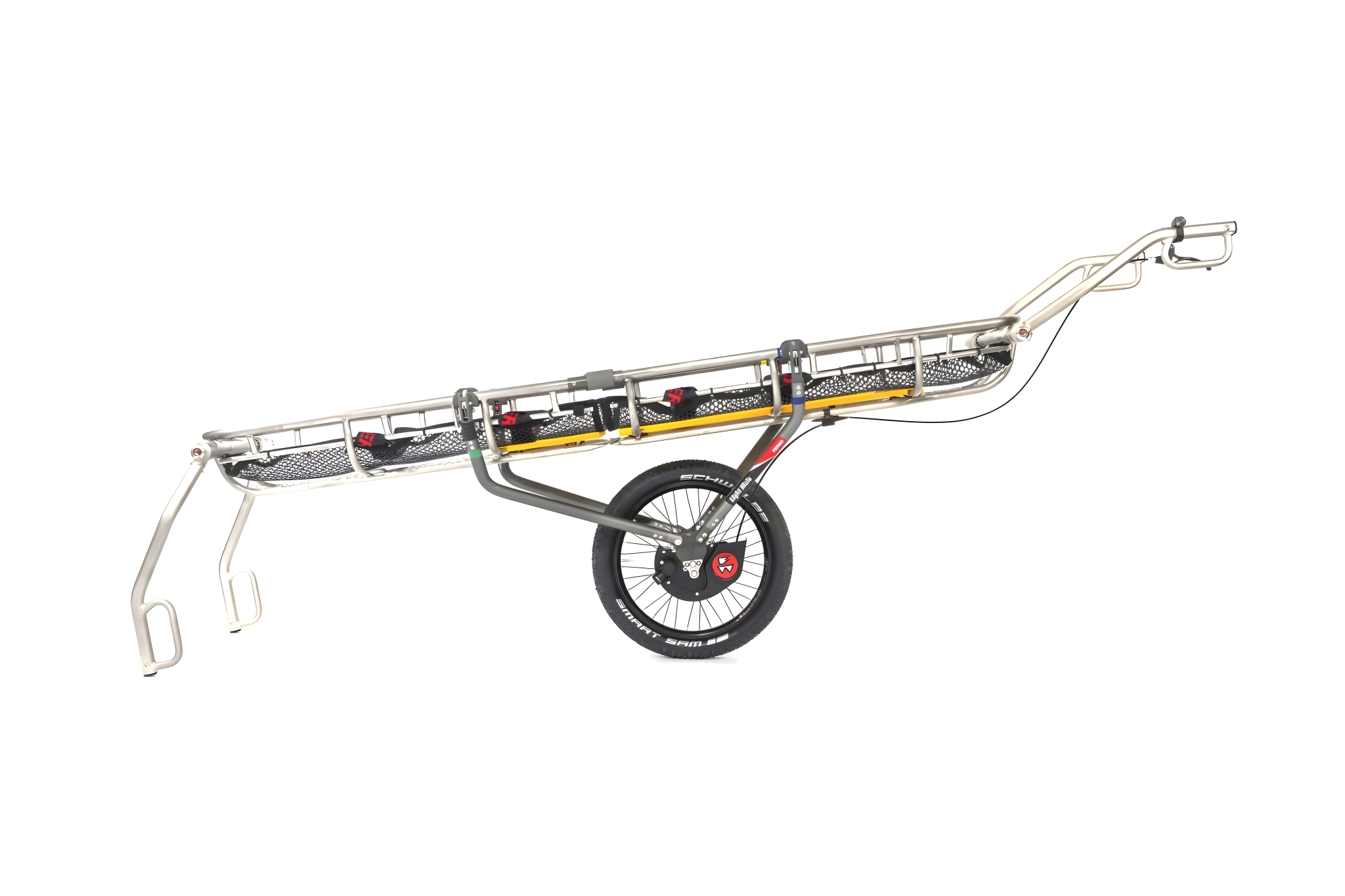 Spesialdesignet hjul med titanramme til våre Titan-serie redningsbårer. Hele designet gir et veldig lett system som kan demonteres, bæres over en lengre avstand og brukes til selv de mest avanserte redningsoperasjoner i vanskelig terreng. Hele hjulsystemet har en totalvekt på bare 12 kg! Denne løsningen må ikke forveksles med enklere, rimeligere og tyngre løsninger i stål, som er på markedet.